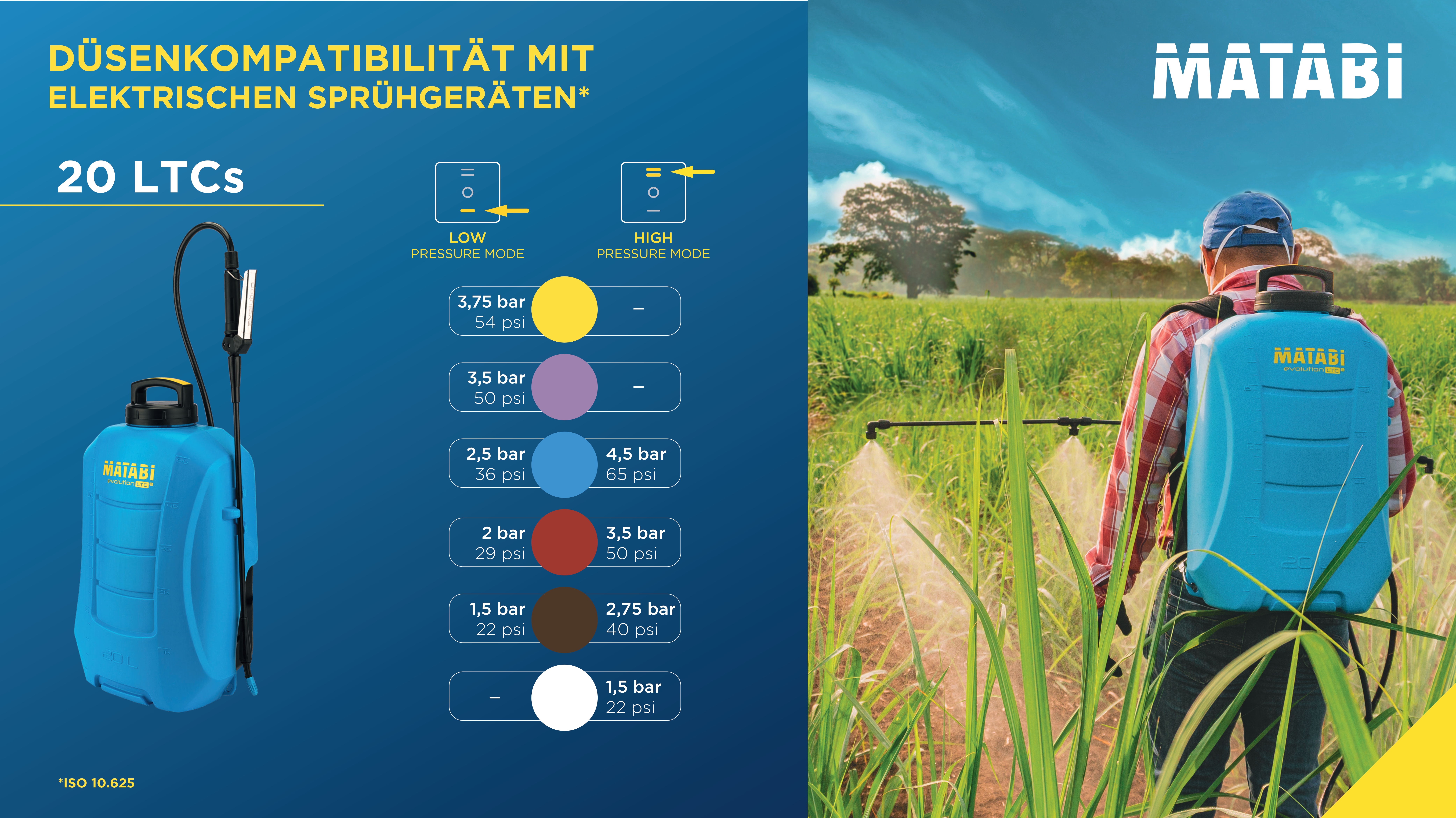 Es enthält einen Düsenset, die eine feine Tröpfchengröße und eine größere Abdeckung bei Insektizid- / Fungizidbehandlungen garantieren und die Abdrift reduzieren und die Wirksamkeit erhöhen bei Herbizidbehandlungen.