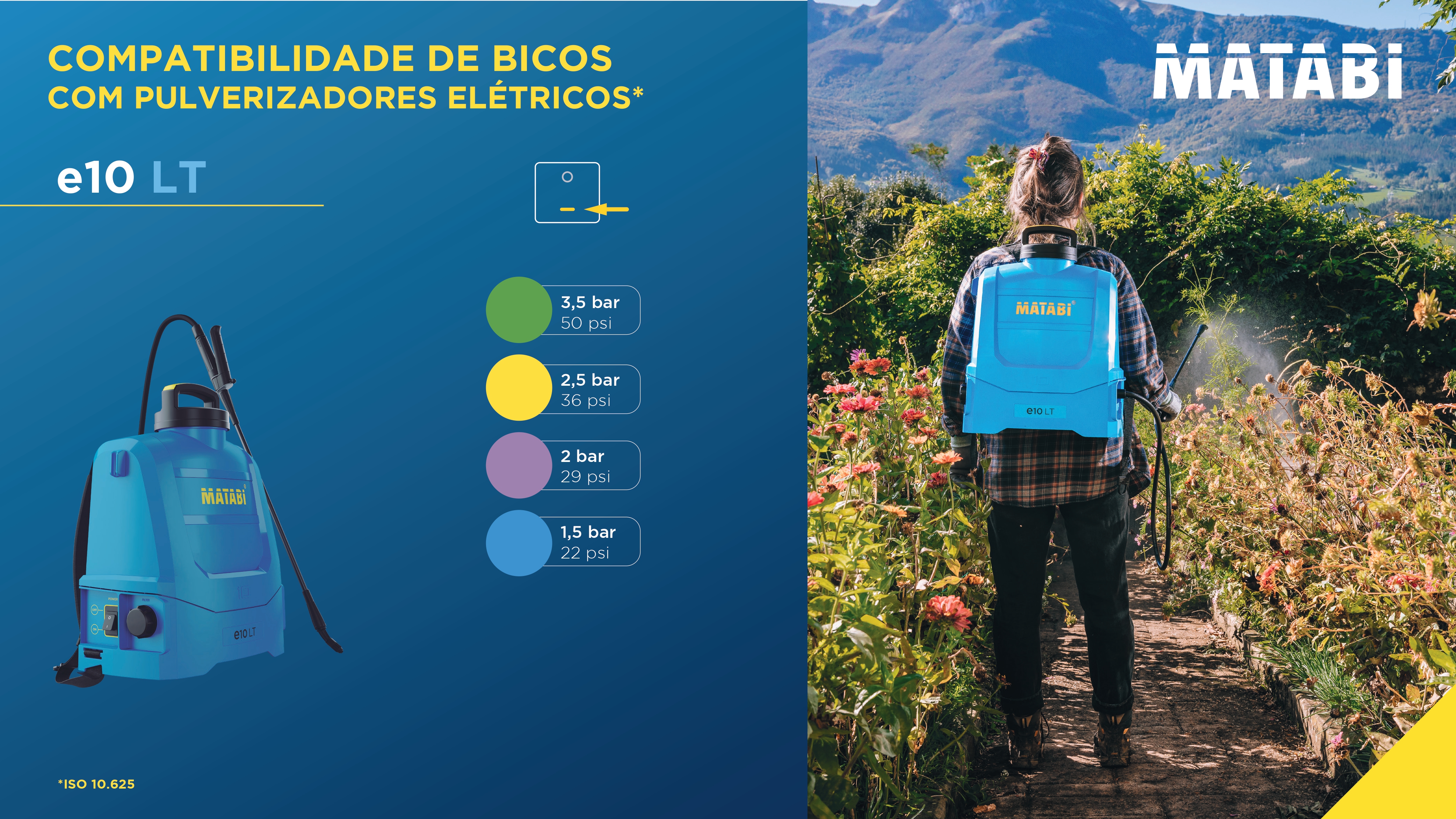O Matabi e10 LT é a escolha ideal para quem procura um pulverizador elétrico compacto e versátil, com a tecnologia necessária para realizar tratamentos fitossanitários de forma eficiente e sem esforço.