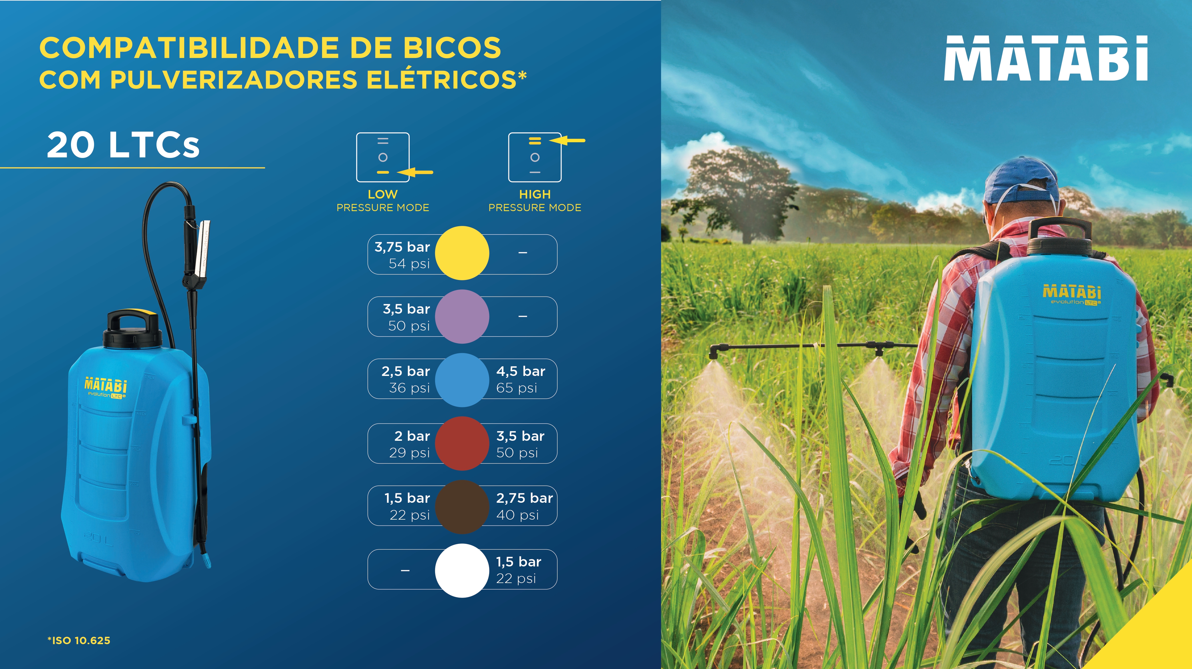 Inclui um conjunto de bicos para garantir tamanhos de gotas finos e maior cobertura em tratamentos inseticidas / fungicidas e para reduzir a deriva e aumentar a eficiência em tratamentos herbicidas.